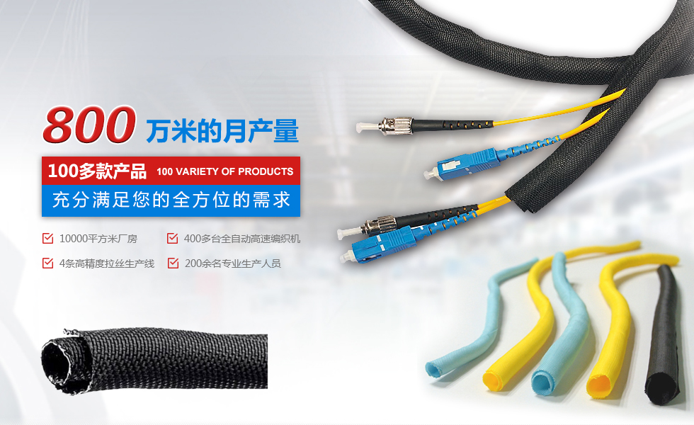 自主設計、研發、規模化大型生產企業 擁有廠房10000平米,400多臺全自動。高速編織機四條高精度紡絲生產線,員工200余人,月產量800萬米,中國最大絕緣保護套管生產企業之一。